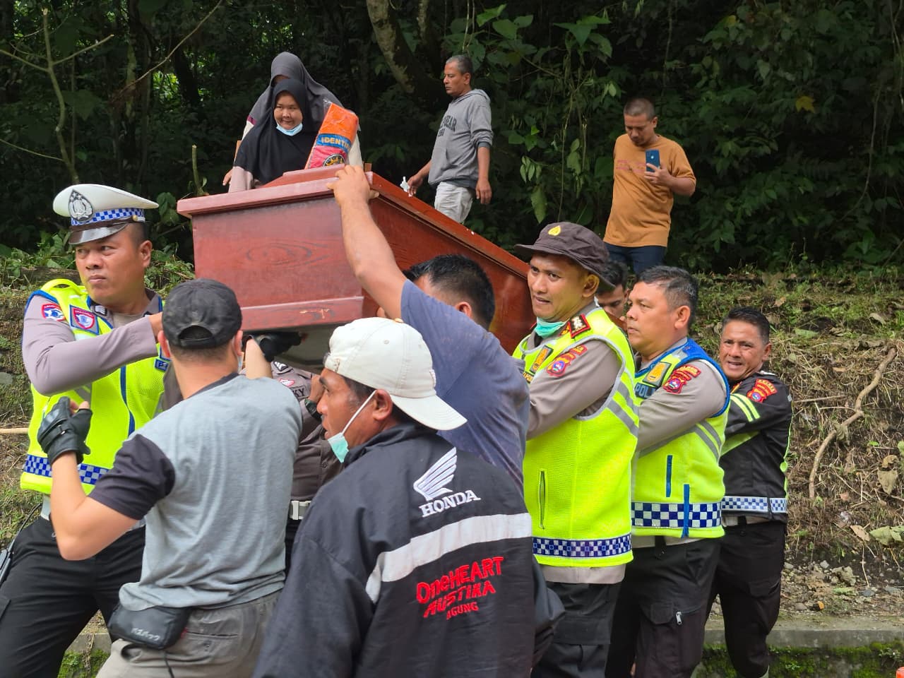 Dalam situasi genting tersebut, Polres Padang Panjang bergerak cepat. Personel kepolisian membuka jalur alternatif dan mendampingi proses pengantaran jenazah dengan penuh kehati-hatian melalui medan terjal dan berat.